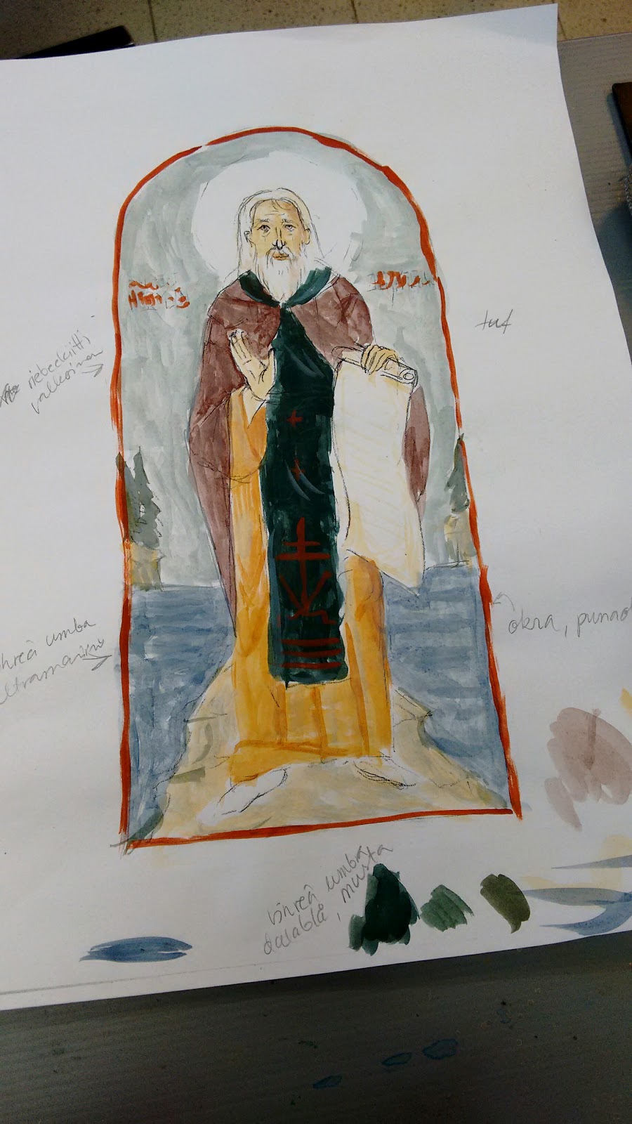 The teacher, Raija Kanninen, was new to me, so I felt I needed the comfort of an old friend. Maybe it was the frost that reminded me of St Herman. I started drawing with only a few pictures of other male saints for reference, but he turned up promptly.